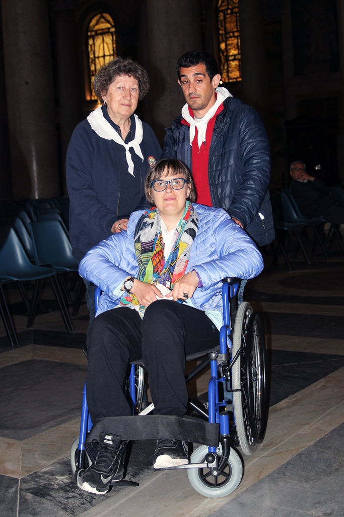 Visto il brutto tempo l’udienza per i disabili è stata spostata in sala Nervi dove qualche fortunato di noi è riuscito anche a salire sul palco e ricevere il saluto personale del Papa. Gli altri hanno assistito all’udienza dalla piazza San Pietro sotto intensi scrosci di pioggia.