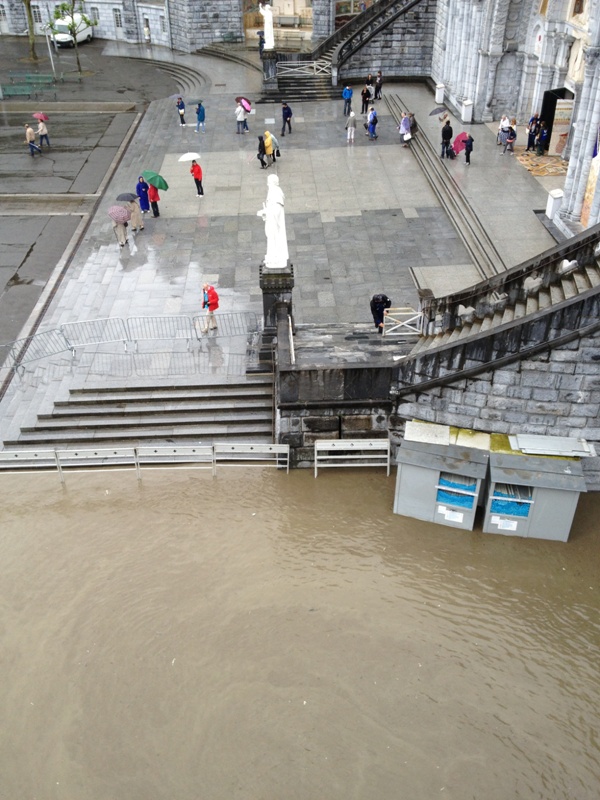 Purtroppo l’acqua del Gave ha continuato a salire nel corso della giornata, fino a sorpassare il livello di ottobre 2012. Alle 16 circa il Santuario è stato chiuso e alle ore 21 si è stati costretti ad evacuare anche il Salus in quanto l’acqua aveva raggiunto il trasformatore di corrente che alimenta tutta la struttura. Alle 22.30 tutti gli ospiti del Salus sono stati risistemati al Florance, giusto in tempo che anche il generatore è stato sommerso.