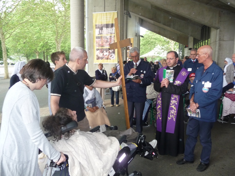 Il terzo giorno di pellegrinaggio è iniziato con un bel sole che faceva ben sperare in un’altra giornata calda e soleggiata come quella di ieri. Dopo la Celebrazione Penitenziale si è svolta la Via Crucis sulla prateria (quella dedicata ai malati era chiusa per pericolo di esondazione del gave). Tutte e due le cerimonie si sono svolte in comunione perfetta con gli amici della Sezione Ligure. Poi, purtroppo, il tempo ha iniziato a mutarsi in pioggia e la temperatura si è notevolmente abbassata fino a raggiungere i 15 gradi alle ore 18!
